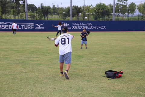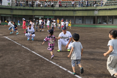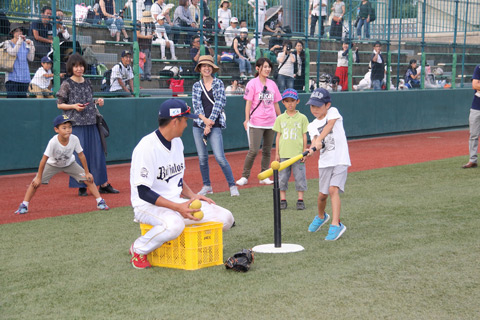 | 内容 | AとB アナウンスの紹介により守備位置に着き、その場で選手を迎えます。 C バファローズ選手が指導する、やわらかいボールとバットを使った、初心者向けの親子野球教室です。※野球道具の準備は不要です。 |