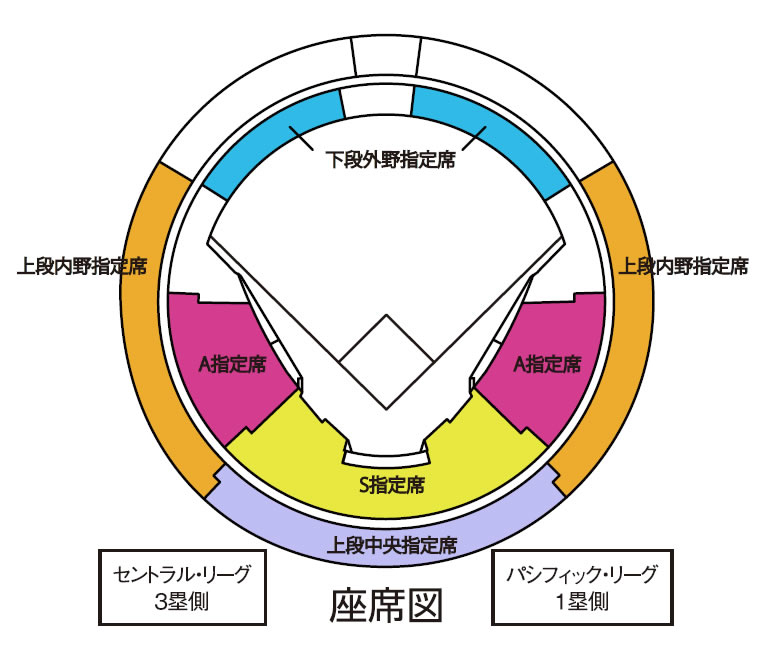 ●上段中央指定席:4,500円(税込)●上段内野指定席:4,000円(税込) ●下段外野指定席:3,500円(税込) ※4歳以上から入場券が必要です。 ※上記以外の席種につきましては取り扱いしておりません。 ※オールスターゲームの座席エリアはオリックス・バファローズ主催試合開催時の座席エリアの座席位置とは異なります。 |