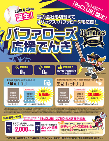 「バファローズ応援でんき」は、シン・エナジー株式会社が、Bs CLUB会員を対象としてサービスを開始する家庭向け電力プランです。このプランをご契約のBsCLUB会員には電気料金の一部がBsポイントとして還元されるほか様々な特典が用意されています。