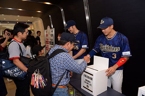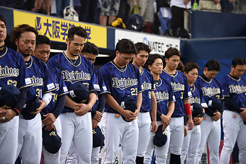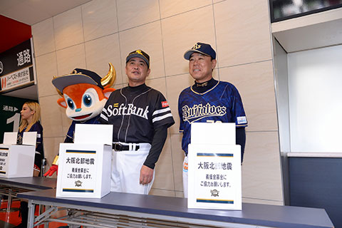 オリックス・バファローズでは、福岡ソフトバンクホークスご賛同のもと、両チームで大阪北部地震義援金の募金活動を行いました。そして、試合前に全員で黙とうを行いました。皆さまのご協力、誠にありがとうございました。被害に遭われた皆さまには、心よりお見舞い申し上げますとともに、一日も早い復興を心からお祈り申し上げます。尚、皆さまからお預かりした募金は、被災地への義援金として寄託いたします。