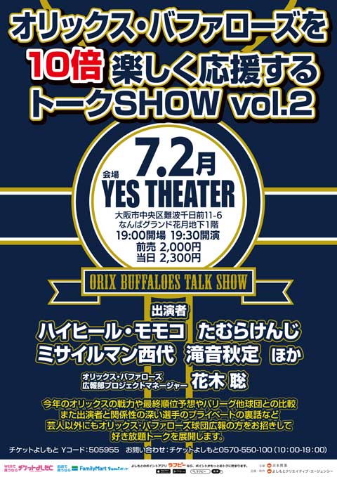 今年のオリックスの戦力や最終順位予想、パ・リーグ他球団との比較、また出演者と関係性の深い選手のプライベートの裏話など、吉本の芸人さんたちによるトークショーが7月2日(月) YES THEATER(なんば花月地下1階)にて開催されます。