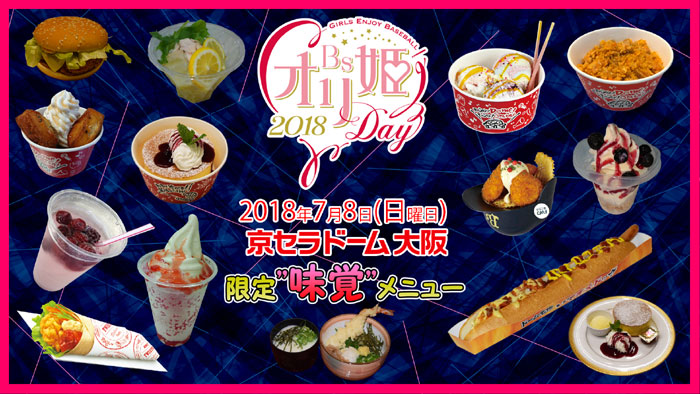 7月8日(日)に開催される「Bsオリ姫デー2018 Supported By FWD富士生命」では、球場内各飲食売店、2階スタジアムモール内各飲食店で、Bsオリ姫デーにちなんだ、限定【味覚】メニューを販売いたします!