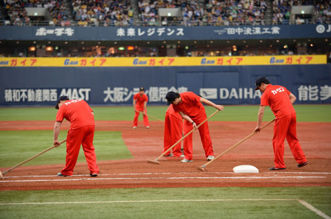白熱する試合のイニング間に、グラウンド整備を体験いただけます。