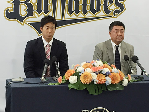 本日、舞洲青濤館にて、岩本輝投手の入団発表記者会見が行われました。