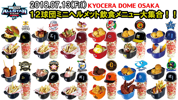 7月13日(金)「マイナビオールスターゲーム2018 第1戦」開催当日に、京セラドーム大阪場内(3~5階)飲食売店各所、2階スタジアムモール内「Baseball & Buffetスターダイナー店舗前」(12時~15時限定)では、12球団ミニヘルメット飲食メニューの販売を行います。ご来場の際は、是非、各球団の色々なヘルメットと味をお楽しみください!