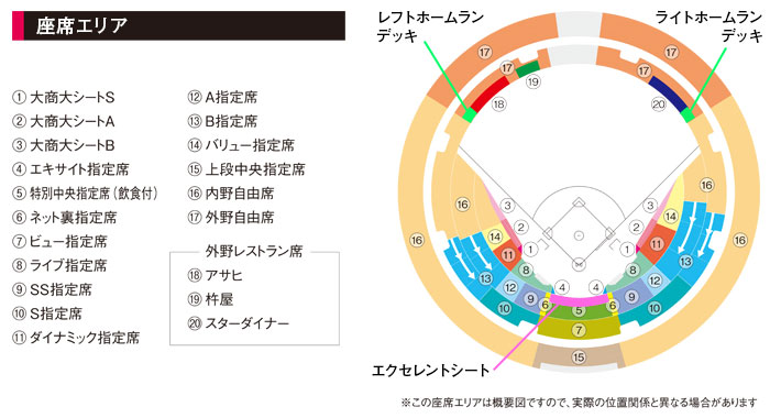 | エクセレントシート ネット裏指定席 | 大商大シート | 特別中央指定席 | エキサイト指定席 ホームランデッキ 外野レストラン席 | |