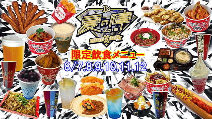 「Bs夏の陣2018」開催の8月7日(火)~9日(木)対埼玉西武ライオンズ戦、8月10日(金)~12日(日)対千葉ロッテマリーンズ戦にて、球場内各飲食売店、2階スタジアムモール内各飲食店で、「Bs夏の陣2018限定飲食メニュー」の販売を行います。