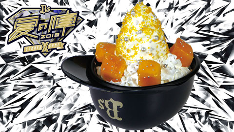 | コメント | ソフトクリームにゴロッとマンゴーが入った、夏にピッタリなパフェ♪キラキラ銀色に輝くトッピングチョコは、『Bs夏の陣2018』のダイヤモンドをイメージしました♪ |
