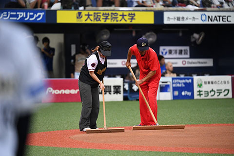 白熱する試合のインターバルで行われるグラウンド整備。