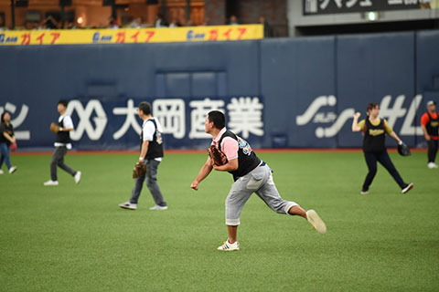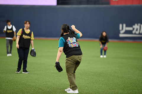 プロ野球選手になった気分でグラウンドでのキャッチボール体験をお楽しみいただきました。