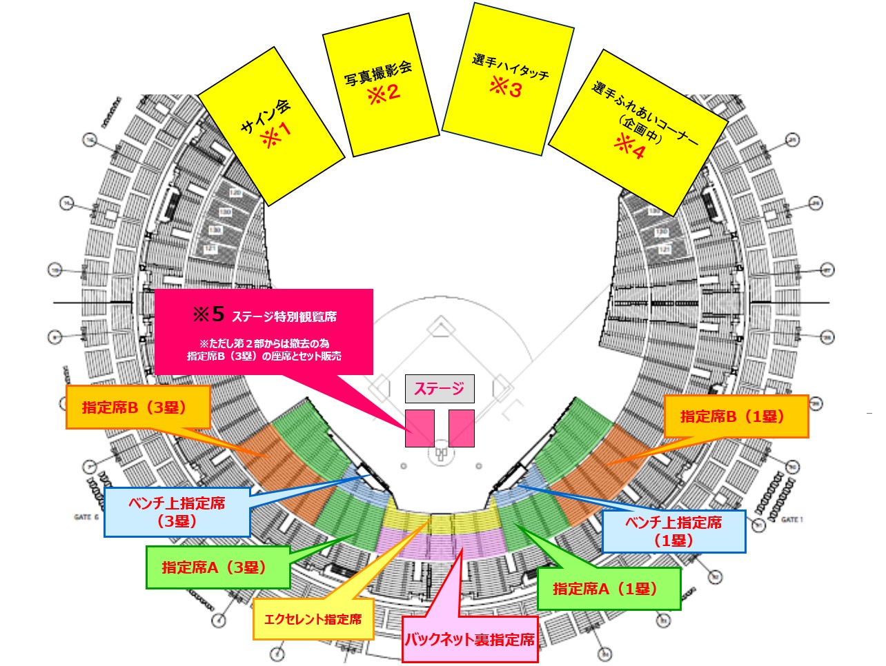 ※5「ステージ特別観覧席(指定席)」チケットをお持ちの方限定となります。ただし、第2部は、グラウンドでの観覧ができませんので指定席B(3塁)の指定エリア(指定エリア内自由席)よりご観覧下さい。