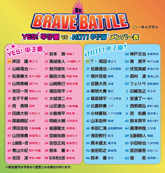 今年は、【Bs BRAVE BATTLE】と題し、バファローズの選手たちが甲子園出場経験の有無による「YES!甲子園」「NOT!甲子園」の2チームに分かれて戦います。「YES!甲子園」のキャプテンは岸田護選手(履正社)、「NOT!甲子園」のキャプテンは、T-岡田選手(履正社)が務めます。さらに今年もゲストMCに「霜降り明星」さんをお迎えしてファンフェスタを盛り上げます!甲子園出場未経験の選手たちからの下克上はあるのか、ぜひご期待ください!!
