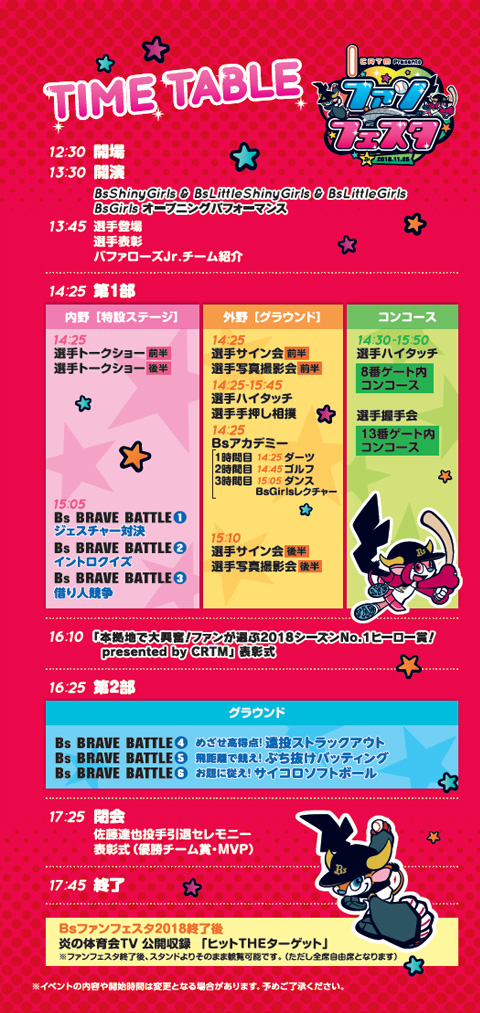 11月25日(日)京セラドーム大阪にて行われる「CRTM Presents Bsファンフェスタ2018」のタイムスケジュール&ゲストMCが決まりましたので、お知らせいたします。