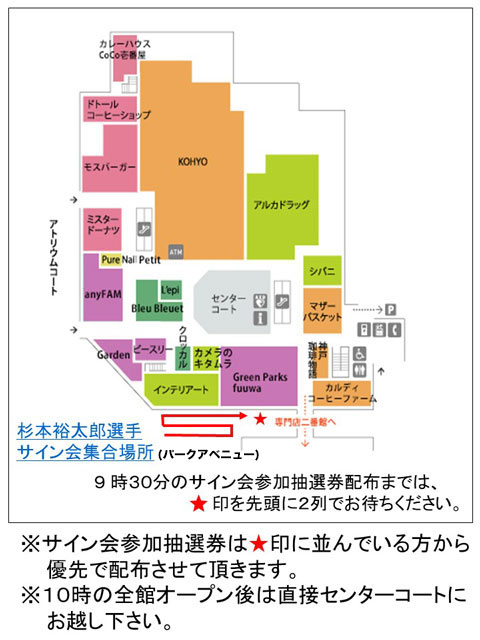 | 【その他】 | *サイン会参加のための抽選券は、当日9:30の時点で、パークアベニュー(下記図の集合場所)にいる先着250名様に「サイン会参加抽選券」を配布します。 その後、選手トークショー内で行われる抽選会で当選された75名様(予定)がサイン会へご参加いただけます。 *状況により配布時間、枚数が変更となる場合があります。 | |