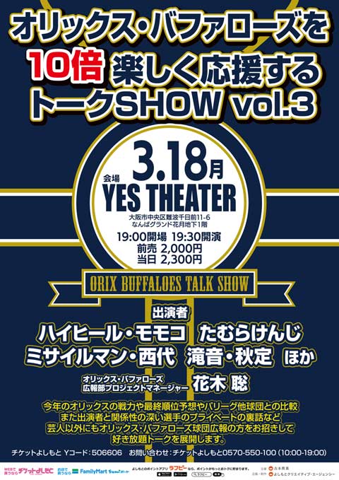 あのイベントが今年も開催決定!シーズン開幕前恒例のトークイベント、『オリックス・バファローズを10倍楽しく応援するトークSHOW vol.3』が、3月18日(月)に開催されます!ハイヒール・モモコさん、たむらけんじさん、ミサイルマン・西代さん、滝音・秋定さんら、吉本を代表する“バファローズ芸人”による、バファローズファンのための爆笑イベント!現在、入場チケットを好評発売中です!皆さまぜひご来場ください♪