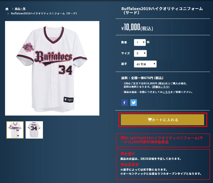 「Bs spirits2019ハイクオリティユニフォーム2,000円割引券」を選択されたお客様へ