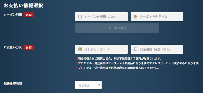 お客様情報入力画面へ進みますので、必要事項と、「お支払い方法選択」欄の[クーポン利用]の項目にて、「クーポンを利用する」にチェックし、お持ちのクーポン番号を入力いただき、確認画面へお進みください。