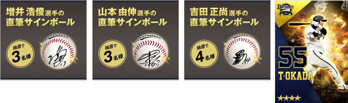 事前登録キャンペーンとして、アプリをご利用開始していただいた方全員にアプリ内で使える課金アイテム“Bダイヤ”を登録者総数に応じて配信します!また抽選でバファローズの選手直筆サインボールが当たります!