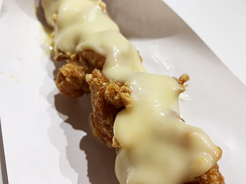 | コメント | コンデンスミルクが入った甘いマヨネーズソースがたっぷりついています。プリプリの唐揚げなのに甘い!?アンバランスを楽しんでください! |