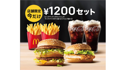 | 商品 | チキンフィレオ+ビックマック+マックフライポテトMサイズ(2個)+ドリンクMサイズ(2個) |