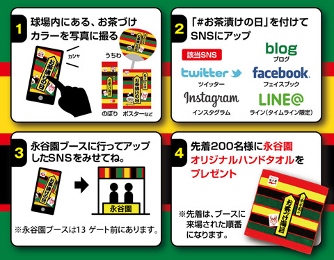 球場内にある、永谷園のお茶漬けの表示物をスマホで撮影し、「#お茶漬けの日」を付けてSNSに投稿してください!永谷園ブース(3Fコンコース内13ゲート付近)で投稿画面を見せていただいた方に、先着200名様にオリジナルタオルをプレゼントいたします。