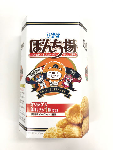 | 商品紹介 | カリッと香ばしく、ほんのり甘い淡口醤油味の後引くおいしさ、ほど良い大きさに軽い食感とのバランスの良さが「揚げせんといえば“ぼんち揚”」の評判。ぼんち揚げとバファローズの特別コラボが実現しました!オリジナル缶バッジ1個付き! ※2個セットはほっと神戸のみで販売です。 |