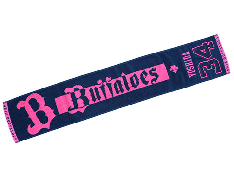 | 商品紹介 | オリ姫から投票いただきました「オリ姫が選ぶバファローズの推しメン(略してオリメン)」トップ5選手のマフラータオル(ピンク)が登場! 発売中のネイビー×ゴールドの新商品、ネイビー×ピンクのカラーです。 |