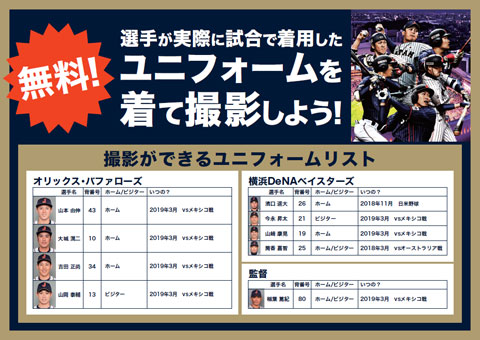 ・オリックス・バファローズ、横浜DeNAベイスターズ所属の侍ジャパン選出選手のオーセンティックユニフォーム(山岡投手、吉田選手等)を着用しての撮影ブースを設置します。