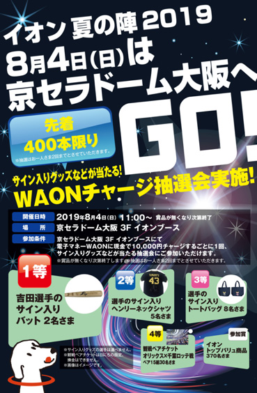 京セラドーム大阪3Fイオンブースにて、電子マネーWAONに現金で10,000円チャージするごとに、選手のサイン入りグッズなどが当たる抽選会に参加いただけます!