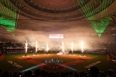 | 0’10 | 炎と光のダンスショー ※バファローズ選手の登場曲に合わせて、パフォーマンスいたします。 ※球場内を暗くいたします。 |
