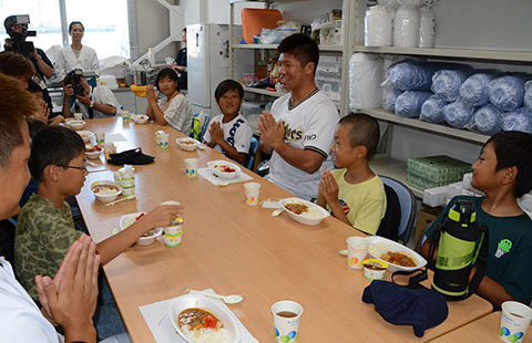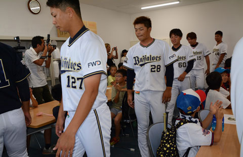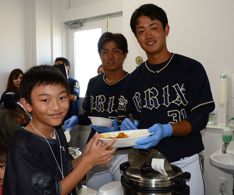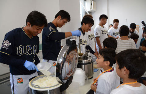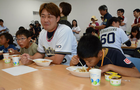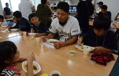オリックス・バファローズは8月7日、オセアンバファローズスタジアム舞洲で「舞洲こども食堂」を開きました。「舞洲こども食堂」は大阪府との連携事業で、第1回目となる今年は西淀川区、港区、西区のこども食堂を利用する小学生20人を招き、プロ野球選手と触れ合う機会を提供しました。