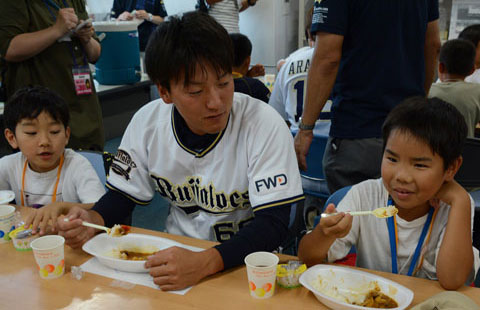 食事は室内練習場のケータリングルームで行われました。こどもたちは、荒西祐大投手、富山凌雅投手、左澤優投手、漆原大晟投手、太田椋選手、頓宮裕真選手、宜保翔選手の7人を大歓声で迎えました。頓宮選手の「いただきます」の掛け声で、カレーをぱくり。和気あいあいとした雰囲気の中「何歳で野球を始めましたか」「どうやったら体がムキムキになりますか」などと積極的に質問していました。
