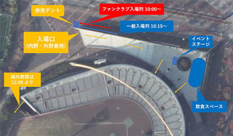 | 整列 | 球場スロープ下看板に従い整列してください。※会員購入列と一般購入列