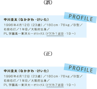 BsTIME10号において、中川圭太選手のプロフィールのドラフト順位に誤りがありましたので、下記のとおり訂正いたします。
