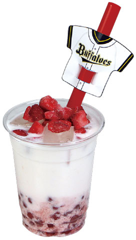 | 商品紹介 | 『けんけんの果実たっぷりイチゴオーレ♪』 可愛いユニホーム型のストロータグが付いた、イチゴの果実たっぷり飲むスイーツです♪ ※継続販売 |