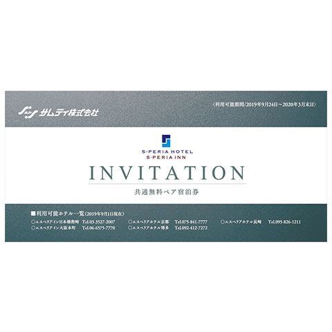 (2)抽選で50組様にサムティグループが運営するエスペリアホテル、エスペリアインの「ペア宿泊券」が50組様に当たります。