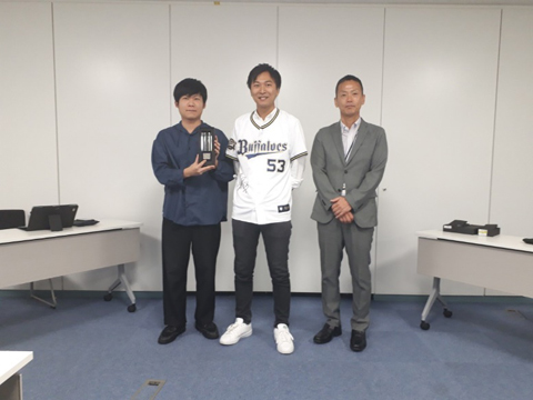 本日、京セラドーム大阪会議室にて、表記表彰式が行われました。コンテスト参加大学は、大阪芸術大学放送研究会、関西学院大学総部放送局、近畿大学付属施設近畿大学放送局、同志社大学学生放送局(五十音順)の4大学。第八回の歴史を持つ同コンテストですが、過去の参加者の中には、朝日放送、秋田朝日放送、鹿児島放送、福井放送、NHK記者等に進んでいる卒業生もいます。それでは、「第八回大学対抗バファローズファーム実況コンテスト」結果発表です。