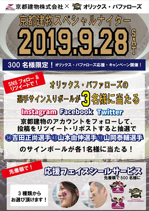 京都建物のTwitter・Facebook・Instagramのどれかをフォローして、投稿をリツイート・リポストして頂いた先着300名のお客様に抽選で吉田正尚選手・山本由伸投手・山岡泰輔投手のサインボールが各1名に当たります!!(おひとり様1回限り)