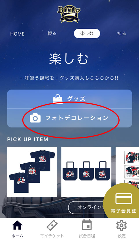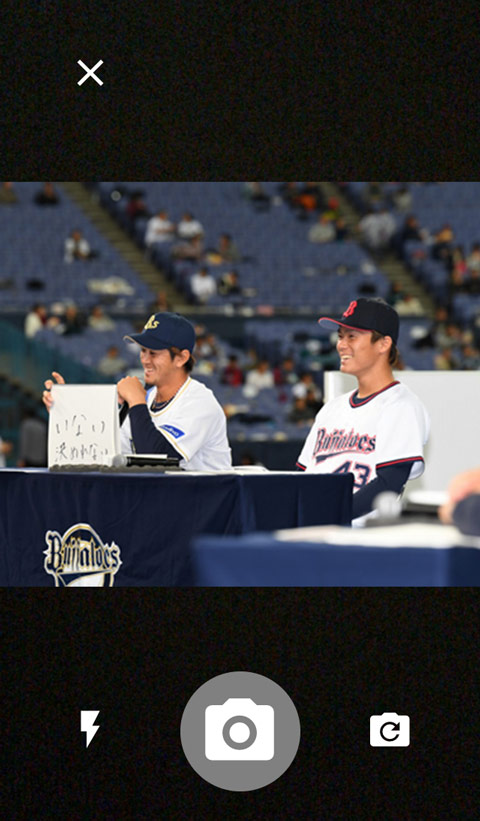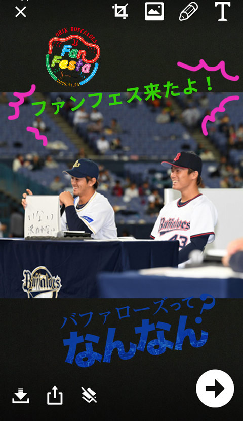 (1)バファローズ公式アプリをインストールし、フォトデコレーション機能を使ってファンフェスタの様子を撮影。