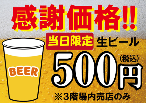 バファローズを応援いただきましたファンの皆様に感謝の気持ちを込めまして、3階場内店舗の生ビールを感謝価格の500円(税込)にて販売いたします!