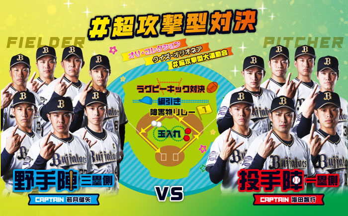 バファローズの選手たちが「投手陣」「野手陣」の2チームに分かれて、海田智行キャプテンvs若月健矢キャプテンによるさまざまな対決を行います!