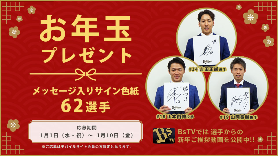 また、本日1月1日(水・祝)から公式モバイルサイトにて、2020年選手決意表明入りサイン色紙と選手直筆サイン入りレプリカジャージの「お年玉プレゼント企画」(※BPB会員限定)を実施します!