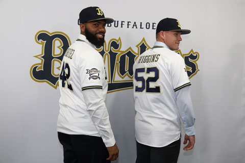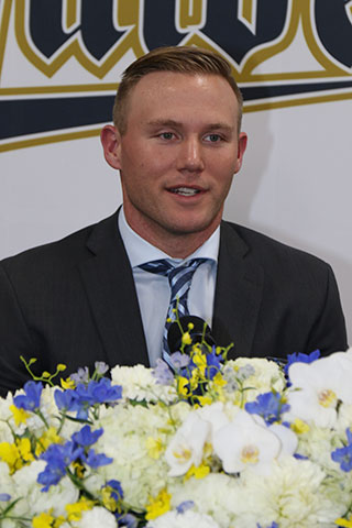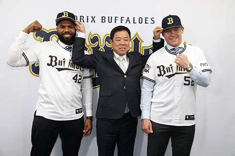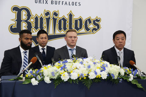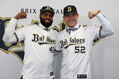 本日1月28日(火)、舞洲青濤館にてタイラー・ヒギンス投手、アデルリン・ロドリゲス選手の入団発表記者会見が行われました。