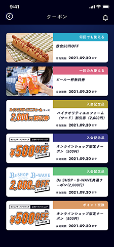 またBsCLUB入会記念品の「2020ハイクオリティユニフォーム(サード)2,000円割引券」「オンラインショップクーポン(500円)1枚」をご選択いただいた方は、こちらから受け取ることができます。