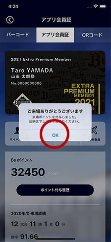 球場内の来場ポイント登録エリアでアプリ会員証画面を開くだけで来場ポイントが自動で付与されます。