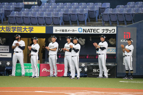 ドーム内をブルーに染める照明の中で医療・介護従事者の皆様に向けて監督・コーチ・選手全員が感謝の拍手を送ります。事前にZOOMにてオンライン収録したバファローズファン約150名もビジョン映像にて参加いたします。