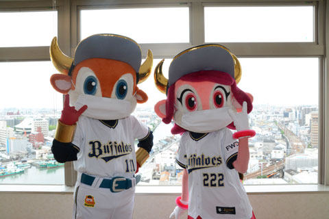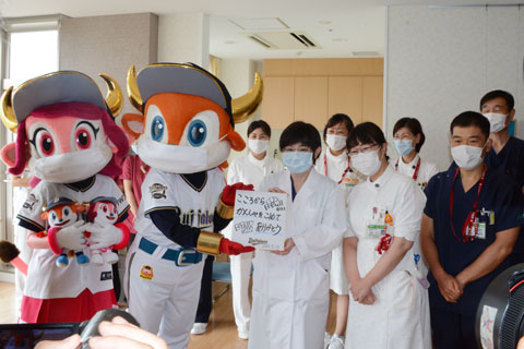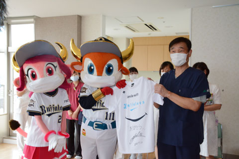 オリックス・バファローズ球団公式マスコットのバファローブル&バファローベルは7月10日、多根総合病院を表敬訪問しました。元気いっぱいのブルとベルがTシャツやぬいぐるみをプレゼントし、医療従事者の方々に感謝の気持ちを伝えました。