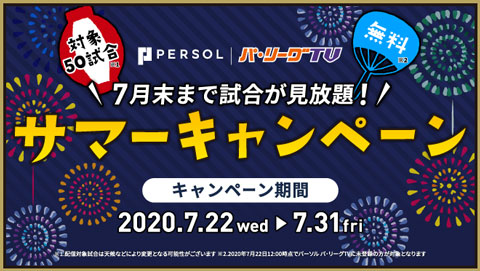 | 対象 | 2020年7月22日(水)12:00時点でパーソル パ・リーグTVに未登録の方 |