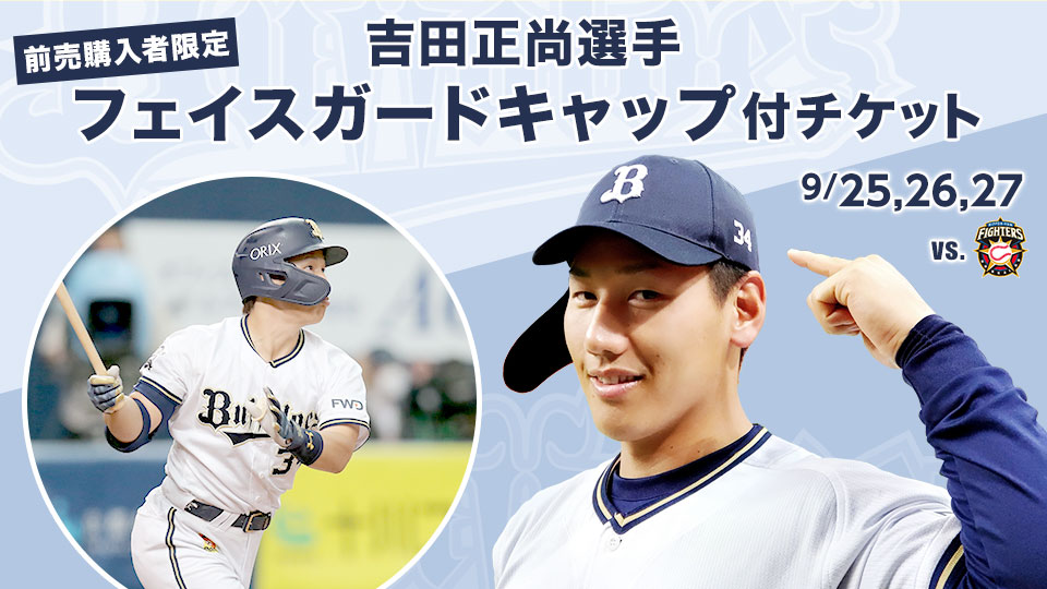 京セラドーム大阪で開催の9月25日(金)~27日(日)北海道日本ハム戦では、「吉田正尚選手フェイスガードキャップ付チケット」を前売購入者・数量限定で販売します。