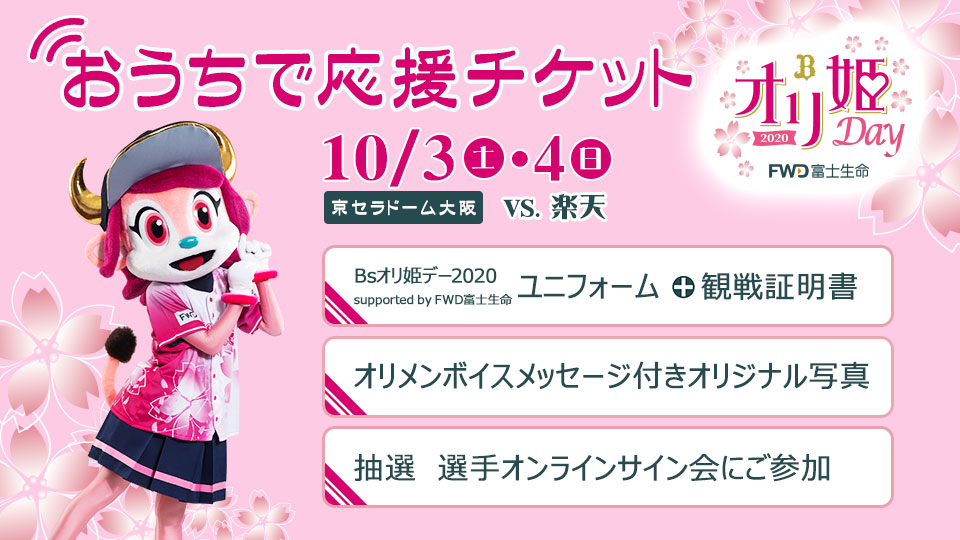 延期となっていた「Bsオリ姫デー2020 supported by FWD富士生命」が10月3日(土)~4日(日)楽天戦で開催決定!今回のBsオリ姫デーでは、いつも遠方やご自宅から熱い声援をお送りくださるオリ姫・オリ達の皆様にもリモートでイベントを楽しんでいただけるよう、「おうちで応援チケット」をご用意しました。